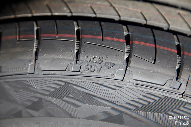 下面我们再来看看德国马牌UC6 SUV轮胎又有哪些亮点。第一眼观看轮胎花纹时就会发现它与其他轮胎品牌显著不同的地方,就是它有“高速导流槽”。也是这款轮胎最独特的特点,是德国马牌轮胎的工程师创新设计了让水在轮胎表面之下快速流走的技术特点,大大提升了湿地操控性能。这一技术减少了湿地驾驶中风险最大的水滑效应,大大提升湿滑路面安全性。除了高速导流槽能够有效增加轮胎的湿地抓地力,出色的湿地表现也离不开4条宽阔的排水沟槽,经测量中间沟槽的深度是7.42mm。
