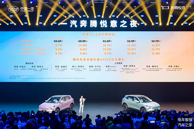 一汽奔腾悦意之夜,是一场新能源汽车的盛宴,更是一次品牌理念的革新。奔腾悦意以“亲和、松弛、时尚、活力”的品牌形象,聚焦“品智悦享家”,致力于为用户提供高品质的新能源汽车。从技术到产品,从服务到生态,奔腾悦意都以用户为中心,全方位满足用户的需求。作为开篇之作的悦意03,以“起步即高配”的诚意,全系标配高阶配置,让超长续航的电车真正触手可及。而未来2年投放的6款产品,更是让人充满期待。从乌镇的夜色中驶出,奔腾悦意以“为生活添悦意”的理念,开启了新能源汽车的亲和时代。未来,奔腾悦意将持续深耕新能源市场,以触手可及的价格满足广大用户对品质好车的向往。