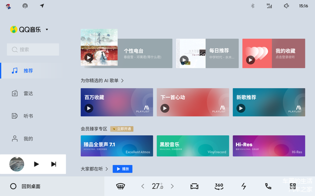 23个哈曼卡顿扬声器遇上QQ音乐臻享专区,就像给耳朵装了杜比全景声解码器。新增的臻品音质2.0把音乐采样率提升到母带级别,而黑胶模式让老歌镀上时光滤镜般的颗粒感。当开启驾享3D环绕音时,导航提示会化作立体声从头顶洒落,而音乐旋律则在脚底形成低音震浪,这种分层音场设计让每个座位都成了VIP听音位。