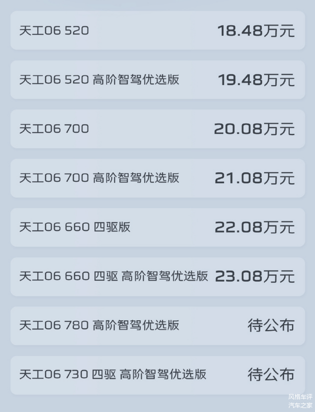 要说天工06最狠的招数,还得是价格。18.48万起的预售价,实际上市价格可能还会更低,这个价格直接把刀架在了小鹏G6(17.68万起)和极氪7X(22.99万起)的脖子上。更绝的是,它把“高续航”和“低价”这两个看似矛盾的标签贴到了一起。顶配车型CLTC续航达到了780公里,比特斯拉Model Y长续航版还多出近100公里,价格却便宜了快10万。