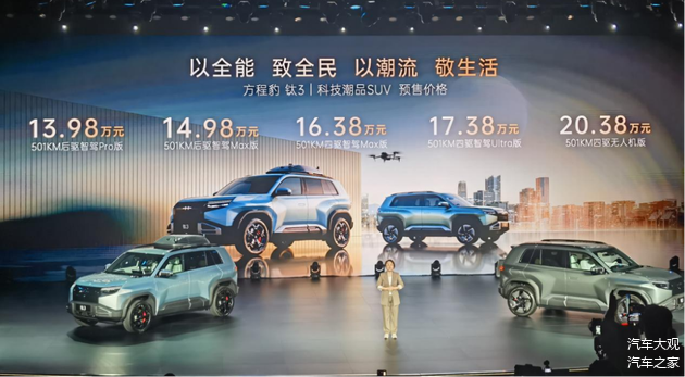 3月31日,比亚迪方程豹第三款车型“ 钛3”,以13.98万至20.38万元开启预售。与前两款产品“豹5”(20-30万元)和“豹8”(30万元以上)不同,钛3不仅系列单开,价格也疯狂下探。