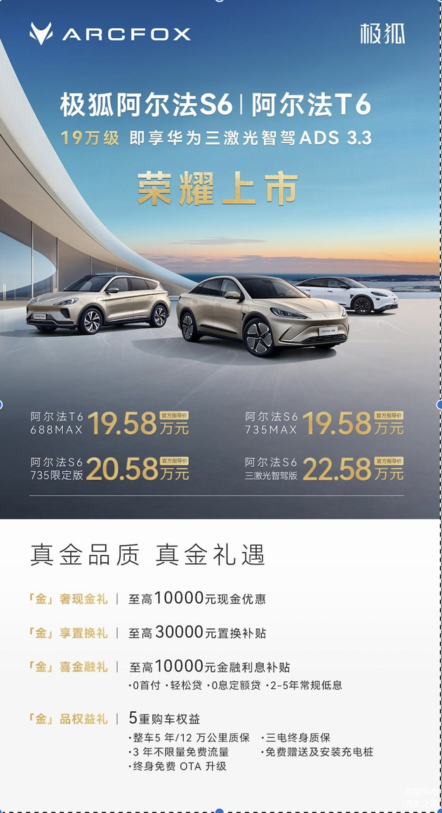 极狐的智能化步伐还在继续,4月2日,极狐汽车再次发布新品,阿尔法新6系上市,将智驾平权的门槛再度降低,同时也将智驾水准大幅抬升。配备了3激光雷达、搭载华为乾崑智驾ADS 3.3的极狐阿尔法S6,20万内就能搞定你敢信?极狐阿尔法T6,用19万级重新定义中大型SUV,给到用户百万级豪车的超品质,也将极狐汽车“死磕品质”的执念再次提到一个新高度。