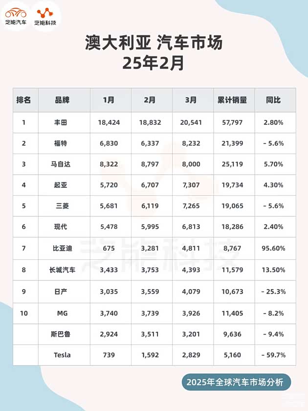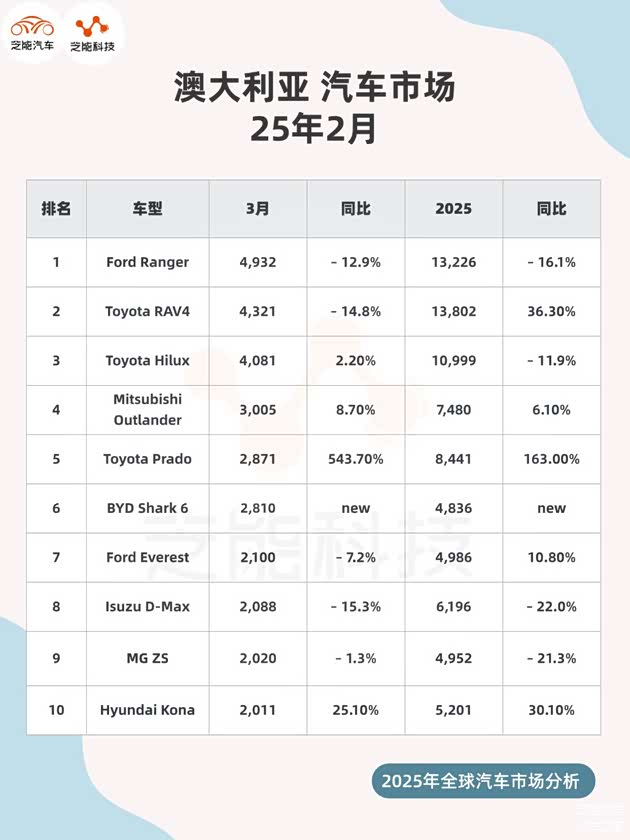 小结2025年3月,澳大利亚汽车市场在销量微增的背景下,混合动力与插电式混合动力车的崛起,消费者对实用性与环保兼顾的需求,而纯电动车的下滑则提示基础设施与成本仍是瓶颈。丰田的稳固地位与比亚迪的异军突起形成鲜明对比,中国品牌正以技术创新和市场敏锐性重塑竞争格局。