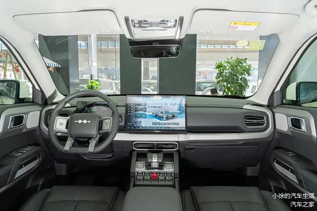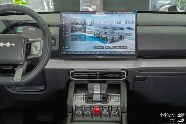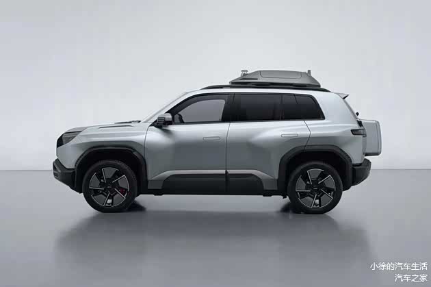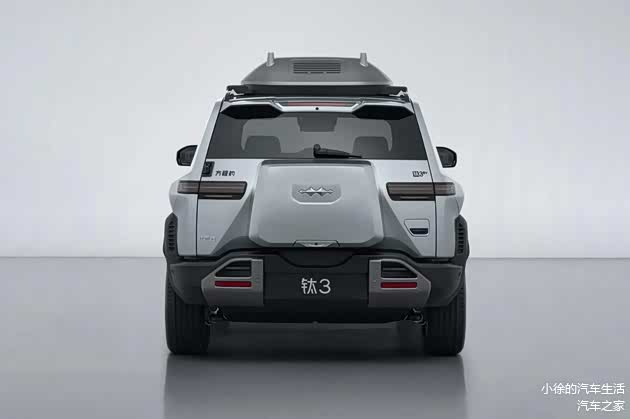 可以看到,钛3的车身线条非常夸张,凌厉而富有力量感。封闭式熏黑前脸搭配梯形下包围,两侧獠牙式银色饰件强化了硬派气质。车侧外扩轮眉和隐藏式门把手兼顾了越野风格与空气动力学,而车尾的侧开式尾门和“小书包”储物箱则呼应了硬派SUV的实用属性,整体颇具机械美感。