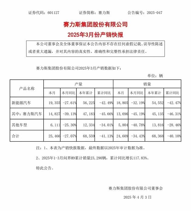 其中,2月份赛力斯汽车销量为15007辆,同比下滑46.52%;产量14843辆,同比下滑51.65%。3月赛力斯集团产销快报显示,3月销量为24609辆,同比下滑34.43%;产量25466辆,同比下滑39.13%。