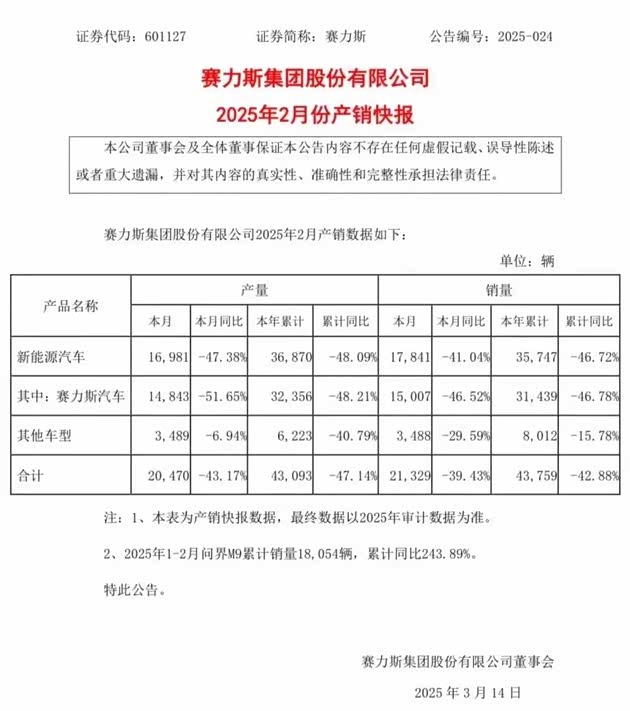 我们先来看下2025年1月份赛力斯集团产销快报,1月份销量22430辆,同比下滑45.82%;产量22623辆,同比下滑50.29%。其中,1月赛力斯汽车销量16432辆,同比下滑47.02%;产量17513辆,同比下滑44.88%。再看2月赛力斯集团产销快报,2月份销量21329辆,同比下滑39.43%;产量20470辆,同比下滑43.17%。