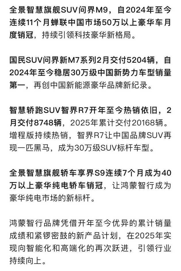 2月问界销量更疲软,来自鸿蒙智行官微数据,问界M7销量仅5204辆,问界M9没有公布销量,仅说11个月蝉联中国市场50万以上豪华车月度销冠,问界M5更是直接没有任何描述。