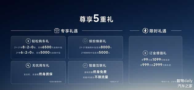 为回馈用户,郑州日产为Z9预售推出“尊享五重礼”,包括最高8万2年0息、至高6500元金融补贴;增换购至高8000元补贴;发动机变速箱终身质保;限时999元定金抵2999元购车款等。郑州日产官方小程序已于今日同步开放Z9试驾预约及订车通道。