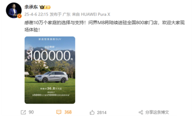 近几日,消息也得到了进一步证实。华为官网人物简介页面以及余承东个人微博认证信息,都统一变更为了“常务董事、终端BG董事长”。与此同时,在4月6 日晚,余承东在微博上依旧转发了问界M8预售达到10万台的宣传海报。