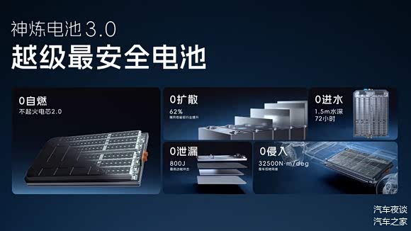 在极限设计方面,神炼电池3.0实现从电芯到用户全场景用车的全覆盖,通过不起火电芯、五横七纵结构设计、CTC电池一体化、神菱盾、神菱甲等技术,达成“0自燃、0扩散、0进水、0侵入、0泄漏”的“五零安全”。在极限制造环节,神炼电池3.0采用PPB级量产最高等级制造品质,以十亿分之一PPB级品质管控,为用户制造万车如一、万里如一的电池。
