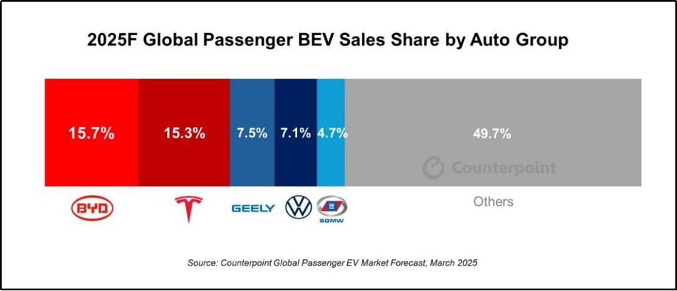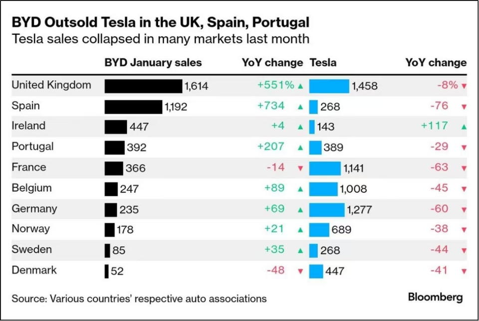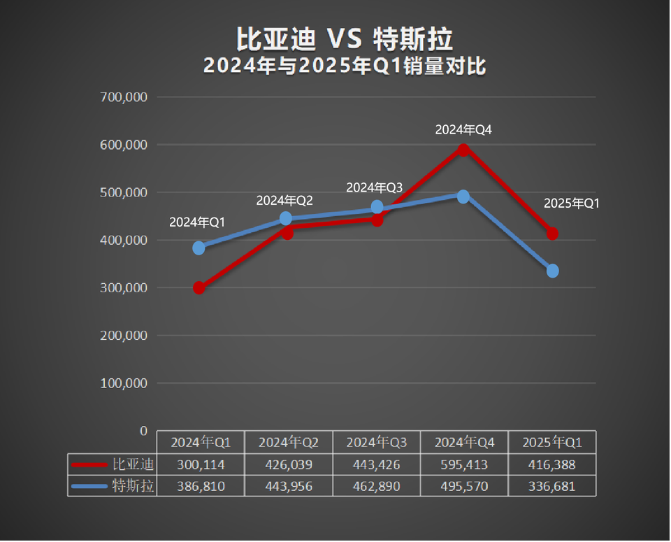 比亚迪2025 Q1夺全球纯电销冠 再度超越特斯拉 ——根据彭博社统计数据显示,比亚迪今年1月在英国、西班牙、葡萄牙三国分别实现551%、734%和207%的销量同比增长;同期特斯拉在这三国的销量下滑8%~76%~29%。回顾比亚迪全球纯电销量首超特斯拉,是2024年四季度。今年一季度,实现第二次赶超。特斯拉今年一季度销量为33.67万辆,同比下降13%。根据各大车企公布的销量数据显示,比亚迪今年一季度纯电动汽车销量为41.64万辆,同比增长38.74%,成为全球纯电销冠。另据市场调查机构Counterpoint Research预测,比亚迪在2025年将以15.7%的市场份额成为全球纯电动汽车销冠,持续扩大纯电汽车市场份额。