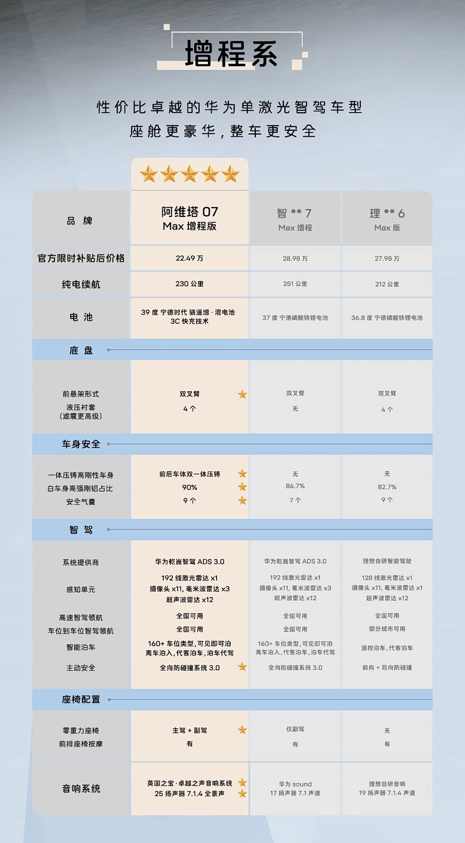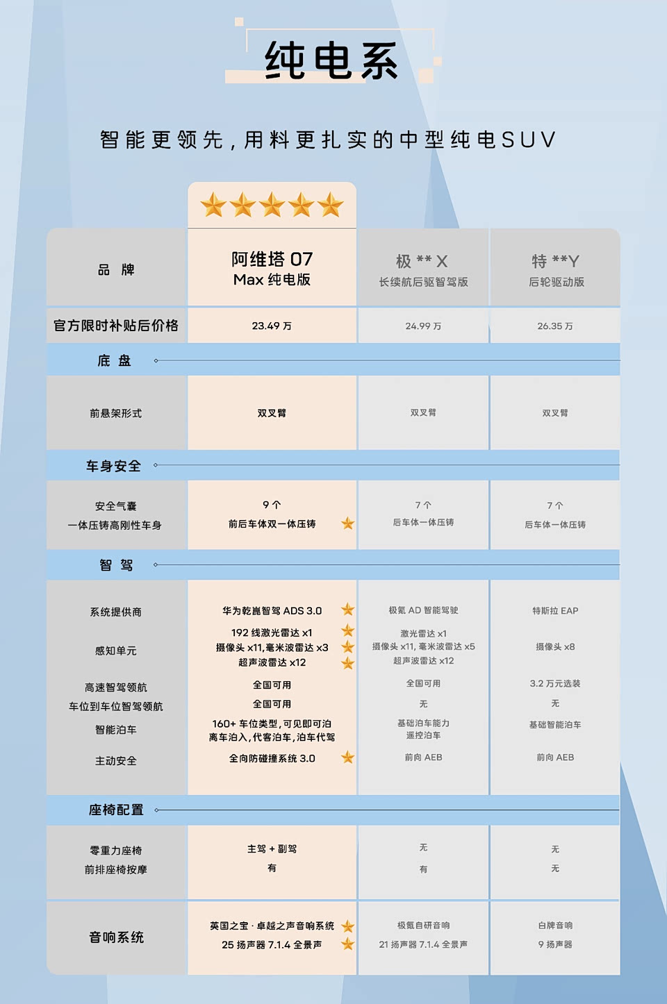 没有对比,就没有伤害? 阿维塔07,是阿维塔上市的第三款车型,也是第二款SUV。 首发上市,即提供了纯电车型和增程版车型。 那么阿维塔07Max增程版和纯电版,分别的竞争力如何呢?分别和各自领域的两款热销车型对比,得出的结论是:价格更低,配置更丰富,也就是性价比更高。 如果说外形,是见仁见智;而配置和数据,是最客观的,不会有争议。