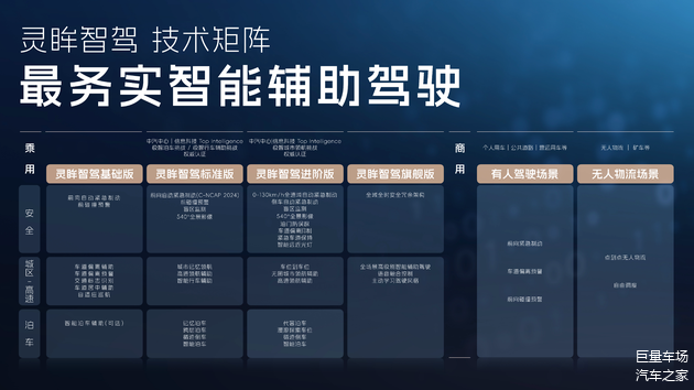 其中,灵眸智驾标准版支持前向AEB、高速NOA、智能泊车等功能,标配城市记忆领航和跨层记忆泊车,为⽤户提供同级别最强辅助驾驶体验。灵眸智驾进阶版则采用能力更高的硬件平台,加入八大主动安全功能,以全速全向AEB、油门防误踩等功能守护用户出行,支持位到位城区领航辅助和代客泊车功能,带来覆盖全程的智驾体验。在此基础上,灵眸智驾旗舰版采用更高标准安全冗余架构和⽣成式世界模型,算力达500TOPS,打通全场景,在实现更高级别智能辅助驾驶的同时,更可融合语音控制、学习驾驶风格,让安全守护的尺度更贴近驾驶者的个人喜好。