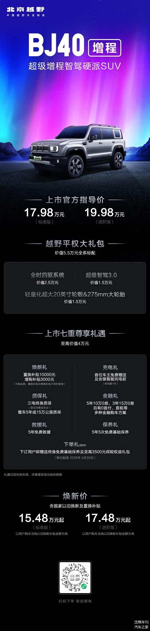 4月7日,“做增程硬派SUV之王 BJ40增程,来了!” 北京越野BJ40增程上市发布会在奥林匹克森林公园国家网球中心盛大召开。用户、媒体、合作伙伴、嘉宾等齐聚一堂,共同见证这一里程碑时刻。BJ40增程定位为超级增程智驾硬派SUV,标准版和进阶版两大车型官方指导价为17.98万-19.98万元,焕新价最低15.48万元起(叠加国补和置换补贴后),真正实现越野平权。