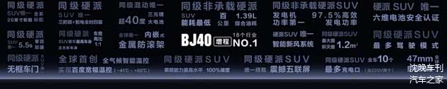 BJ40增程围绕“超级硬派、超级增程、超级越野、超级智享、超级安全”五大核心优势,实现了多项行业领先,包括同级硬派SUV素车最高车身、同级硬派SUV唯一全系标配20英寸轮毂、同级硬派SUV唯一无框车门、同级混动唯一超40度三元锂大电池、同级非承载硬派SUV能耗最低、同级非承载硬派SUV发电机功率第一、同级硬派SUV最快零百加速、全球首创全气候智能温控实现百度宽幅温控、同级硬派SUV拥有最多驾驶模式、同级硬派SUV唯一三把锁+智电全时四驱、同级硬派SUV攀爬能力最高水平、同级硬派SUV唯一搭载震撼五联屏、同级硬派SUV最大面积天窗 1.2m²、同级硬派SUV最多充电口、全球唯一内嵌式金属防滚架、硬派SUV唯一六维电池安全认证、全球唯一47mm护板间隙、硬派SUV唯一智能新风系统。