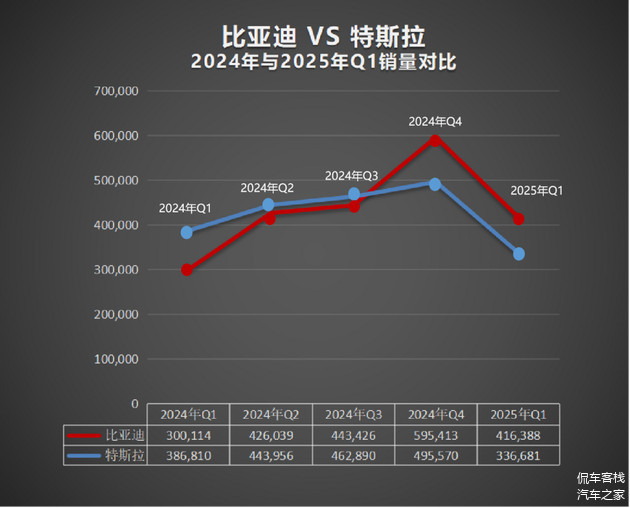 这两年新能源汽车赛道,比亚迪和特斯拉的博弈可以说是很精彩的,而根据各大车企公布的销量数据显示,比亚迪今年一季度纯电动汽车销量为41.64万辆,同比增长38.74%,成为全球纯电销冠。数据显示,2024年四季度,比亚迪全球纯电销量首超特斯拉,今年一季度,实现第二次赶超。特斯拉今年一季度销量为33.67万辆,同比下降13%。