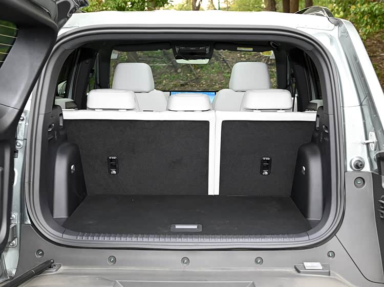 后备厢空间不大,门槛也比较高,隔板下面有不小的储物格,后排座椅靠背能按照比例放倒,接近放平的状态,能扩展出不小的空间,另外它还提供了一个151升的前备厢,一些尺寸不大的物品也可以放到前备厢里,还有就是尾门上悬挂的小书包容积也有28升,配有网兜,也能放不少东西,储物方面基本上是没问题的,全车人的行李可以放得下,另外值得一提的是它采用的是侧开门的方式,好用方便,开口大,尾门内部还配有网兜。后备厢里面提供的还有挂钩、220V电源插口,露营用方便,能多一个接口。