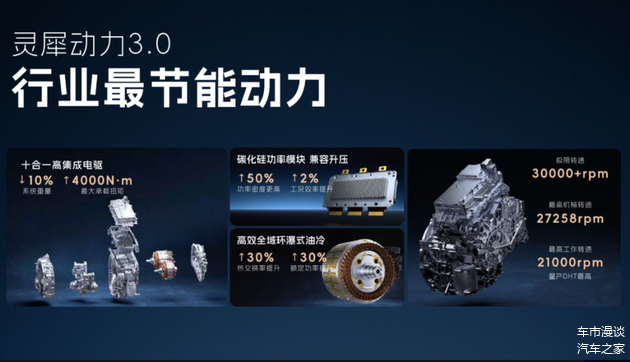 灵犀动力3.0搭载了全新十合一高集成电驱,将 P1 电机、P3 电机、双电机控制器模块、耦合系统模块等关键部件进行高度集成,使系统重量降低了10%,同时最大承载扭矩超过4000N・m,结合主动加热和脉冲加热技术,不仅保证了动力的强劲平顺,还提升了冬季低温环境下的充电性能。高效全域环瀑式油冷技术采用轴向对流式油冷的创新设计,进一步提升了电驱的持续功率。高转子技术的应用,支持 220km/h时速持续行驶。