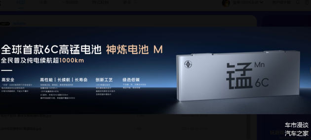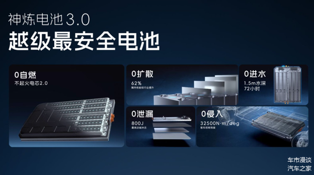 此外,官方宣布神炼电池4.0在神炼电池3.0的基础上,实现了更大的技术飞跃。它将搭配 800V 平台、CTB技术、智能无线BMS技术以及AI 能量管理系统、全新智能温控技术、3D 多面立体热管理和热电分离技术。而6C高锰电池——神炼电池M的加入,更是神炼电池4.0的一大亮点。它具备高安全、高性能、长续航和长寿命的特点,能量密度超过 500Wh/L,可实现6C充电倍率,仅需7分钟即可补能50%,充电 10 分钟就能实现 500 公里的续航里程,彻底解决了用户的里程焦虑。