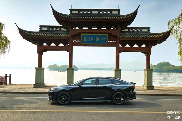 侧身是教科书级的运动轿跑比例。0.78高宽比塑造出近乎超跑的扁平姿态,配合从B柱急速下坠的溜背曲线,形成蓄势待发的箭矢轮廓。19寸星芒轮辋采用双五辐暗刃设计,哑光黑辐条与高亮黑轮毂盖形成层次对比,转动时如暗夜星环般划破空气。侧裙处新增疾风运动套件,以碳纤维纹理饰板与导流鳍片强化贴地飞行的视觉张力。