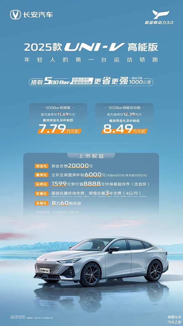 同时2025款UNI-V高能版也焕新500Bar发动机,推出2款新车型:500Bar高能版、500Bar高能运动版,官方指导价11.69万元-12.39万元。2025款UNI-V系列,叠加现金礼及本品、国家置换补贴后,低至7.69万元起。