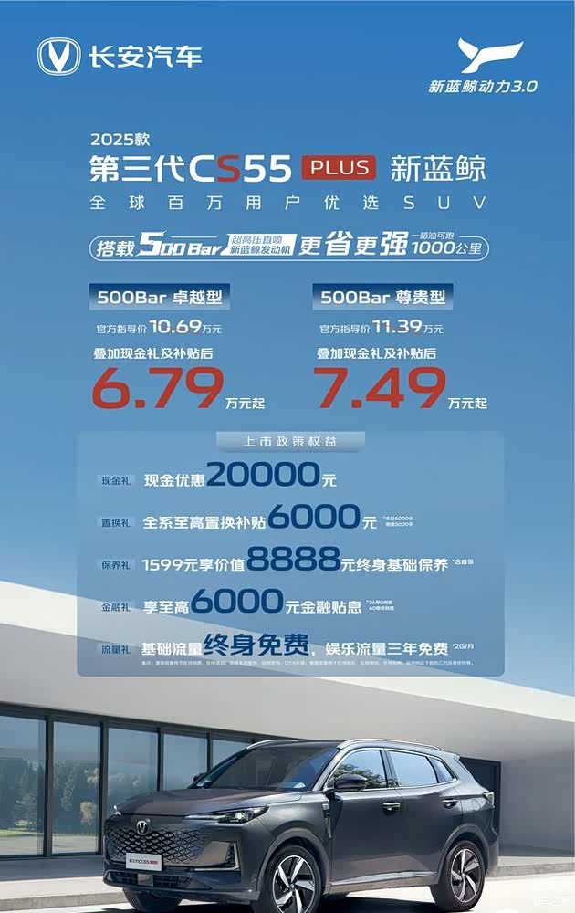 4月8日,长安汽车旗下搭载了500Bar超高压直喷新蓝鲸发动机的三款经典车型迎来焕新价格及权益发布。其中2025款第三代CS55PLUS共推出2款车型,官方指导价10.69-11.39万元,叠加现金及补贴后售价6.79-7.49万元。