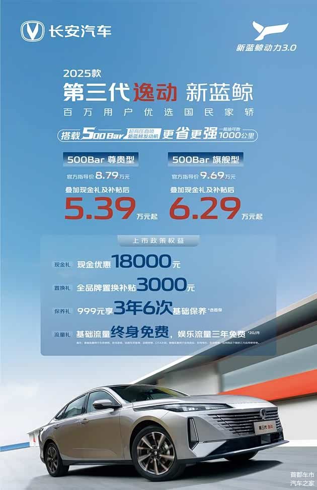 2025款第三代逸动共推出3款车型,官方指导价8.39-9.69万元,叠加现金及补贴后售价4.79-6.29万元。