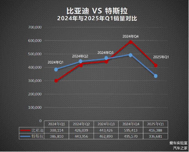比亚迪与特斯拉,作为全球新能源领域的两大头部品牌,一直在技术和销量上引领着行业的发展。然而随着一升一降,行业格局正在悄然发生变化。今年一季度,比亚迪纯电动汽车销量为41.64万辆,同比增长38.74%;而特斯拉同期销量为33.67万辆,同比下降13%。因此在2024年四季度,比亚迪全球纯电销量首超特斯拉之后,今年一季度,实现第二次赶超,再次登顶全球纯电销冠。