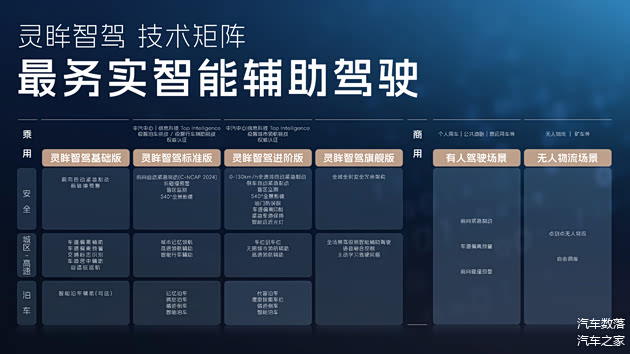 上汽通用五菱同时发布了灵眸智驾技术矩阵,基于两段式端到端架构、可解释端到端架构和⽣成式世界模型的不同进化路线,规划了基础版、标准版、进阶版和旗舰版四大层级。其中灵眸智驾标准版支持前向AEB、高速NOA、智能泊车等功能,标配城市记忆领航和跨层记忆泊车;灵眸智驾进阶版以全速全向AEB、油门防误踩等功能,支持车位到车位城区领航辅助和代客泊车,带来覆盖全程的智驾体验;灵眸智驾旗舰版则采用更高标准安全冗余架构和⽣成式世界模型,算力达500TOPS,打通全场景,实现更高级别智能辅助驾驶。不仅如此,上汽通用五菱还推出了行业首个商用车安全智驾普及方案,针对有人驾驶和无人物流两大商用场景,量身定制安全的智驾方案。