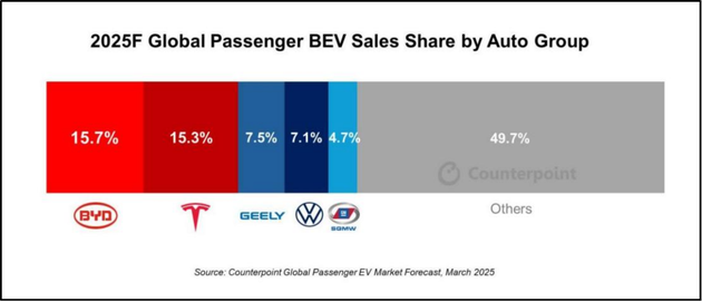 马斯克这回是几边不讨好,甚至连特斯拉的经营都耽误了。相关数据显示,已经连续两个季度,比亚迪在纯电动汽车的销量上超过了特斯拉,比亚迪也由此连续两个季度成为了纯电动汽车的全球销冠,持续扩大纯电汽车市场份额。而且根据机构预测,2025年比亚迪将以15.7%的全球市场占有率成为2025年度的电动汽车全球销冠。