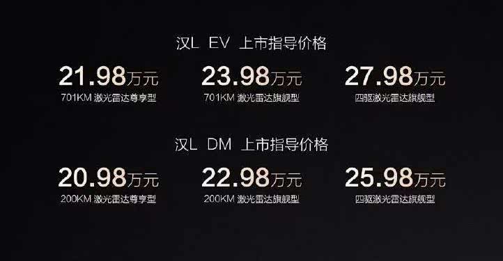 汉L EV单电机21.98万起,单电机旗舰23.98万,双电机(1102马力)四驱版27.98万!