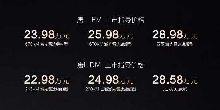 唐L DM用22.98万的旗舰版入门,四驱旗舰24.98万,无人机版本是28.58万。