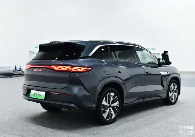 侧面造型方面,唐L车顶弧度明显,整体风格魁梧有力,行李架的设计增添了一丝力量感。腰线采用分段式设计,点缀出车身侧面的层次感;门把手采用弹出式设计,降低风阻;轮眉和侧裙部分设计有隆起的筋线,凸显肌肉感;轮毂采用五辐式低风阻造型,简洁而大气。