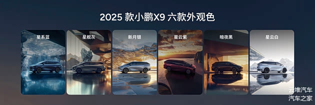 2025款小鹏X9采用明日星舰设计语言,X- Robot家族式前脸、天际悬浮车顶,风阻系数低至0.227。新增的20英寸星耀悬浮轮毂配备动态定轴技术。新车提供六款车身颜色,新增星云紫、星系蓝和哑光版星舰灰配色,其中哑光漆面采用纳米级消光剂,具备更好的耐磨性和抗污性。内饰方面,用户可选择气宇灰、月影咖和深空灰三种配色,满足个性化需求。
