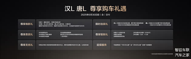 伴随汉L的上市,比亚迪王朝网还准备了七重购车礼遇。截至6月30日24:00前完成购车开票,用户可享尊享金融礼,0首付、0利息任选其一;尊享置换礼,置换补贴至高35000元;还有尊享无忧礼、尊享贵宾礼、尊享智联礼、延保服务可选。其中,尊享置换礼中除了至高20000元国补,更有首销期限时置换补贴10000元,同时比亚迪老车主额外可享5000元置换补贴加码!此外,用户额外可享限时选装礼,包括价值6000元的琉光银、墨竹青外观免费选装、价值4000元的绸锻棕内饰免费选装。尊享购车礼遇加持,进一步降低消费者的购车用车成本,让更多年轻用户畅享旗舰级出行体验。