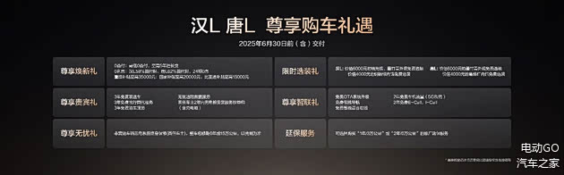 伴随唐L的上市,比亚迪王朝网还准备了七重购车礼遇。截至6月30日24:00前完成购车开票,用户可享尊享金融礼,0首付、0利息任选其一;尊享置换礼,置换补贴至高35000元;还有尊享无忧礼、尊享贵宾礼、尊享智联礼、延保服务可选。其中,尊享置换礼中除了至高20000元国补,更有首销期限时置换补贴10000元,同时比亚迪老车主额外可享5000元置换补贴加码!此外,用户额外可享限时选装礼,包括价值6000元的墨竹青外观免费选装、价值4000元的霞绯红内饰免费选装。尊享购车礼遇加持,进一步降低消费者的购车用车成本,让更多年轻用户畅享旗舰级出行体验。