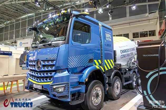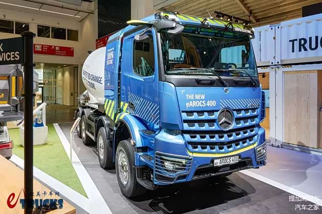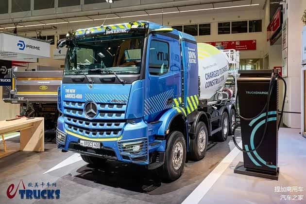 奔驰目前为eArocs 400纯电动工程车提供32吨和41吨两个版本,均为8×4底盘,主推用于水泥搅拌车及自卸车,可凭借低噪音、零排放出入城市核心区,也可在夜间运营。在展台上,奔驰展示了搭载利勃海尔HTM 905上装的水泥搅拌车,这款上装的容积为9m³。相较配置近似的常规柴油卡车而言,eArocs 400纯电动水泥搅拌车的容积少了近1m³,是可以接受的水准。