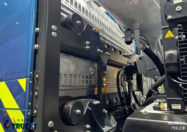 驾驶室下方位置原用于容纳柴油发动机。但在电动版车型上,这块空间便被空了出来。为了合理利用,奔驰eArocs 400纯电动工程车采用了eActros 600车型同款的FrontBox“前箱”集成式附件系统。它并不直接参与车辆的驱动,但有着整车“神经中枢”的地位,它集成了多个控制单元,还集成高压、低压组件及电动空压机,完成车辆的电力分配、控制工作,并为悬挂气囊、刹车等气路系统提供空气来源。