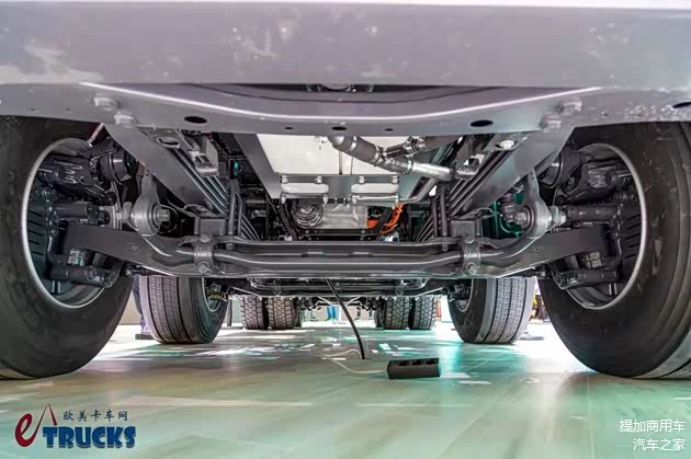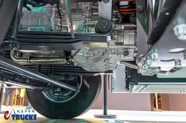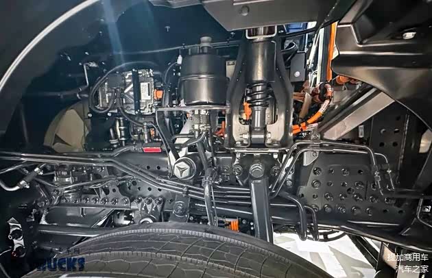 得益于中央电驱动系统,车辆的车桥、车架及悬挂组件均与柴油版Arocs车型保持了一致,带来更高的可靠性,越野性能也有所保障。底盘最低点为车桥,这样一来就能避免托底、擦碰伤及昂贵且危险的各类电气设备,这也是中央电驱动系统相对电驱桥的优势之一。