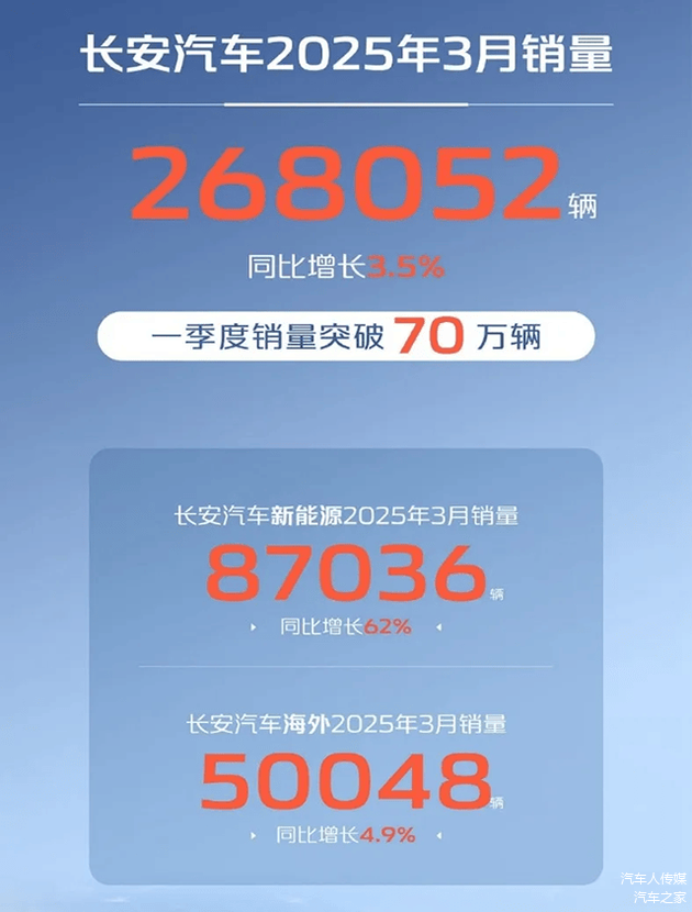 4月3日,长安发布了3月暨一季度业绩。2025年开年之后,长安汽车市场表现一如既往地稳健,销量破70万辆。