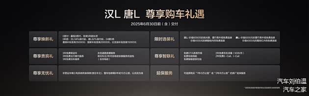 伴随汉L的上市,比亚迪王朝网还准备了七重购车礼遇。截至6月30日24:00前完成购车开票,用户可享尊享金融礼,0首付、0利息任选其一;尊享置换礼,置换补贴至高35000元;还有尊享无忧礼、尊享贵宾礼、尊享智联礼、延保服务可选。其中,尊享置换礼中除了至高20000元国补,更有首销期限时置换补贴10000元,同时比亚迪老车主额外可享5000元置换补贴加码!此外,用户额外可享限时选装礼,包括价值6000元的琉光银、墨竹青外观免费选装、价值4000元的绸锻棕内饰免费选装。尊享购车礼遇加持,进一步降低消费者的购车用车成本,让更多年轻用户畅享旗舰级出行体验。