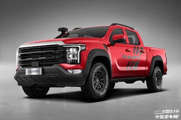 火星7探界版基于火星7柴油四驱版打造,在外观部分换装涉水喉、285宽度越野大轮胎等诸多越野套件,提升整车的越野素质和野外防护能力;火星9越野刀锋版仅有一款车型,前脸部分采用全新六边形前格栅中网设计,配备三段式铁制高强度竞技杠、高位进气涉水喉、铁制侧踏、越野轮眉、285AT大尺寸轮胎等。