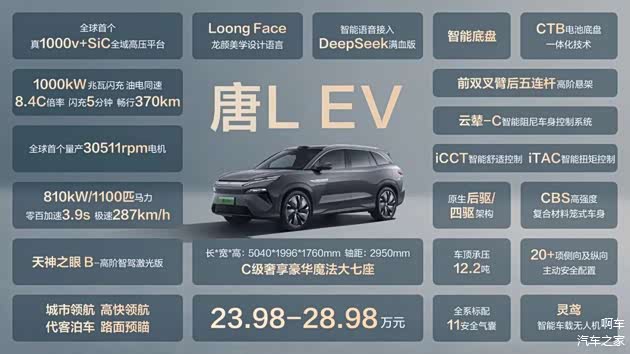 兆瓦闪充、3万转电机、激光雷达……等一堆比亚迪最先进的技术,全都落在新上市的 汉L、唐L车型上了,但它的售价就是介于20.98万元到28.98万元之间,你觉得香不香呢?