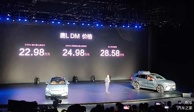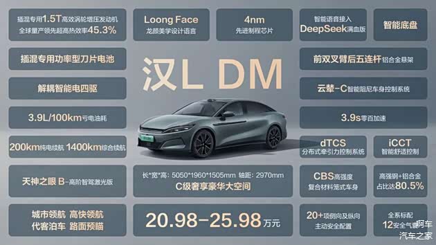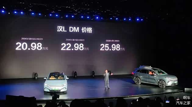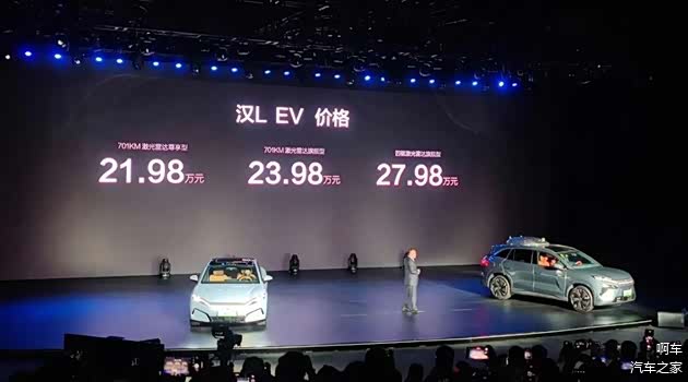 汉L车系其下有3款汉L EV纯电动力车型,售价分别是21.98、23.98、27.98万元;还有3款汉L DM插电混合动力车型,售价分别是20.98、22.98、25.98万元。