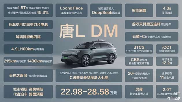 至于唐L DM则是搭载第五代DM技术,包含DM-p王者混动、DM-i超级混动,其中DM-p前、后双电机车型零百加速最快4.3秒,DM-i单电机车型则亏电油耗最低仅4.9L/100km,电池满电条件下可提供200km纯电续航里程,满油满电能提供1430km综合续航里程!