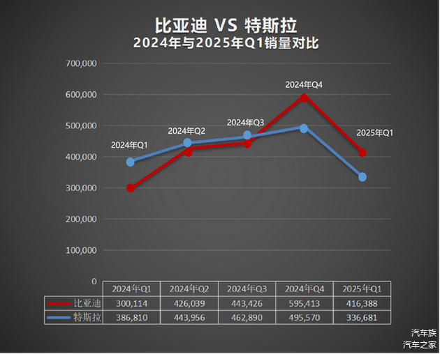 数据显示,2024年四季度,比亚迪全球纯电销量首超特斯拉,今年一季度,实现第二次赶超。特斯拉今年一季度销量为33.67万辆,同比下降13%。