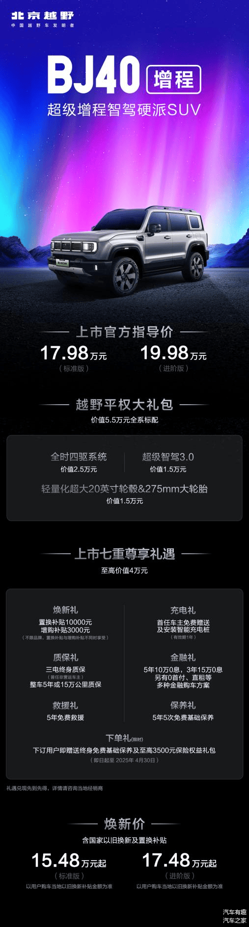 可以看到,BJ40增程以免费赠送的越野平权大礼包和价值40000元的上市七重尊享礼遇,重新定义了十五万级超级增程智驾硬派SUV的新标准,直接引爆了订购热潮。