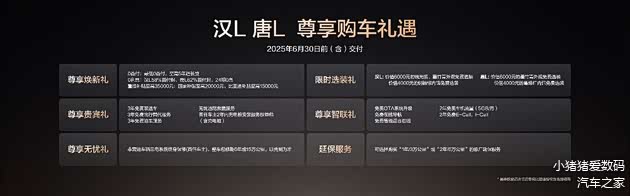 伴随汉L的上市,比亚迪王朝网还准备了七重购车礼遇。截至6月30日24:00前完成购车开票,用户可享尊享金融礼,0首付、0利息任选其一;尊享置换礼,置换补贴至高35000元;还有尊享无忧礼、尊享贵宾礼、尊享智联礼、延保服务可选。其中,尊享置换礼中除了至高20000元国补,更有首销期限时置换补贴10000元,同时比亚迪老车主额外可享5000元置换补贴加码!此外,用户额外可享限时选装礼,包括价值6000元的琉光银、墨竹青外观免费选装、价值4000元的绸锻棕内饰免费选装。尊享购车礼遇加持,进一步降低消费者的购车用车成本,让更多年轻用户畅享旗舰级出行体验。