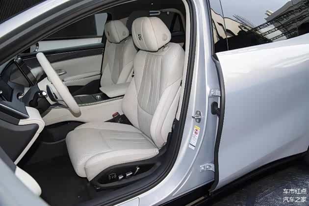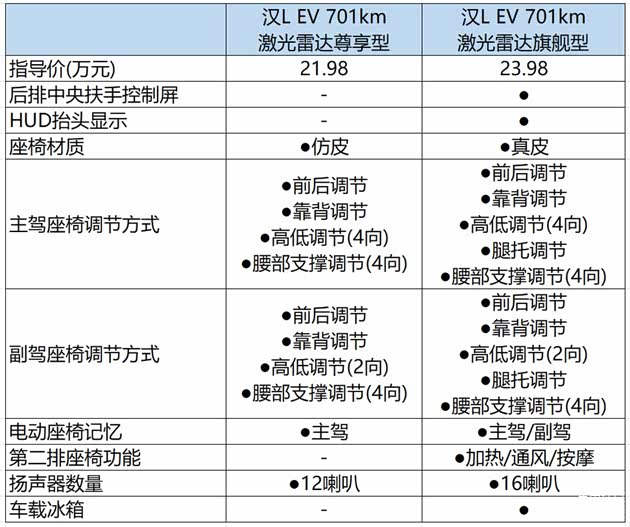 接下来是售价23.98万的701km激光雷达旗舰型,价格贵了2万。升级了真皮座椅,新增了前排座椅腿托调节,副驾座椅记忆,后排座椅的加热、通风、按摩,后排中央扶手控制屏,HUD抬头显示,16扬声器音响,车载冰箱等,主要升级的是舒适性配置。