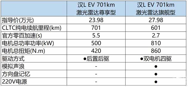 顶配的四驱激光雷达旗舰型售价27.98万,价格贵了4万。首先是性能的升级,前后电机总功率达到810kW,总扭矩860N.m,零百加速仅需2.7s.因为性能大幅提升,但电池容量没变,所有CLTC纯电续航降至601km。其它配置方面增加了模拟声浪,方向盘记忆,车内220V电源等,可以看出除了性能的提升,其它配置升级并不明显。